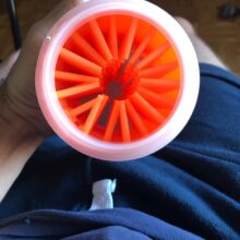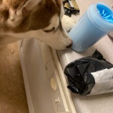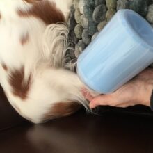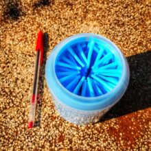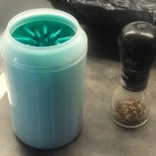 My chihuahua reluctantly agreed to let my grandson clean his paws with this paw cleaner. It consists of a sturdy plastic cup with soft, silicone fingerlets inside for cleaning. Just fill the cup about 3/4 full with warm soapy water and put the dog’s paw in a few times. The paw comes clean in a jiffy. Repeat on the other 3 paws. It can be used on a little or a big dog. It’s portable so it’s good to take camping, to the park, or to use at home.